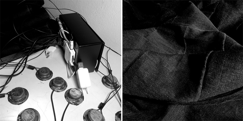 Spherical Aural Chamber: Fabric, Electronics, 8 Channel speaker System. 120 x 120 cm